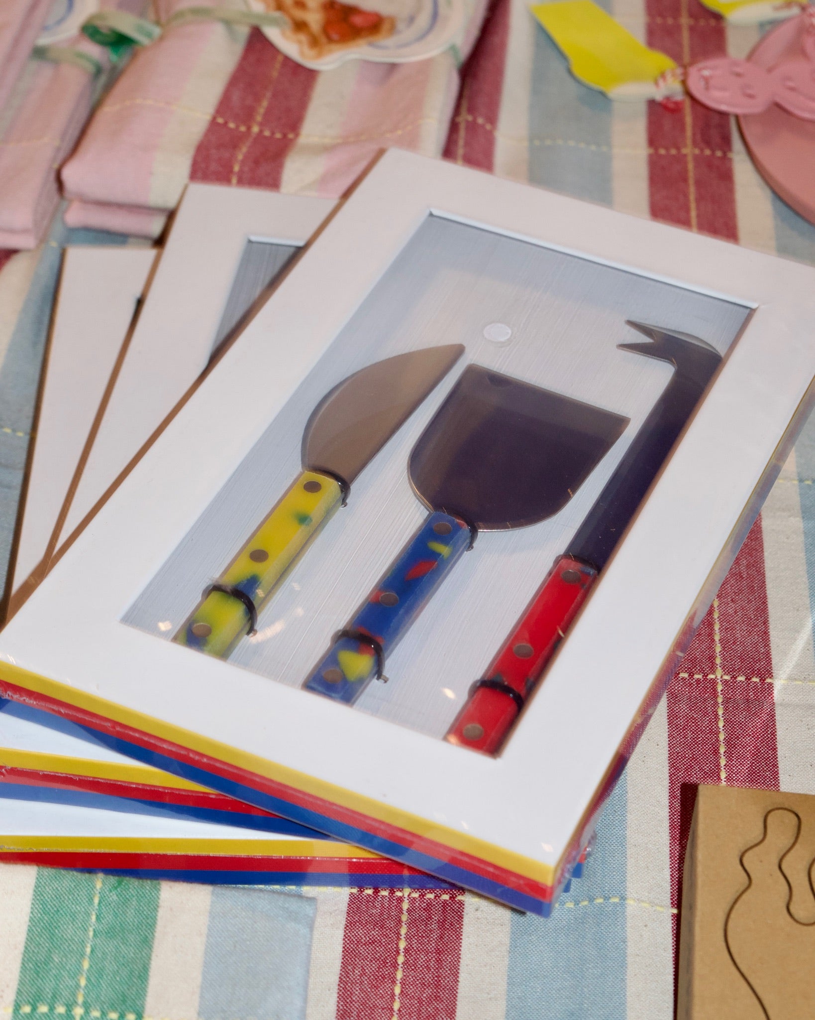 Set of 3 cheese knives by Fredericks & Mae. Includes a soft, semi-soft and hard cheese knife for cheese boards and buffets. Use the pointed knife for parmesan and other hard cheeses, the curved spreader for Brie and other soft cheeses, and the broad blade for everything in between. Pairs perfectly with their cutting boards and your favorite cheese. A lovely gift.