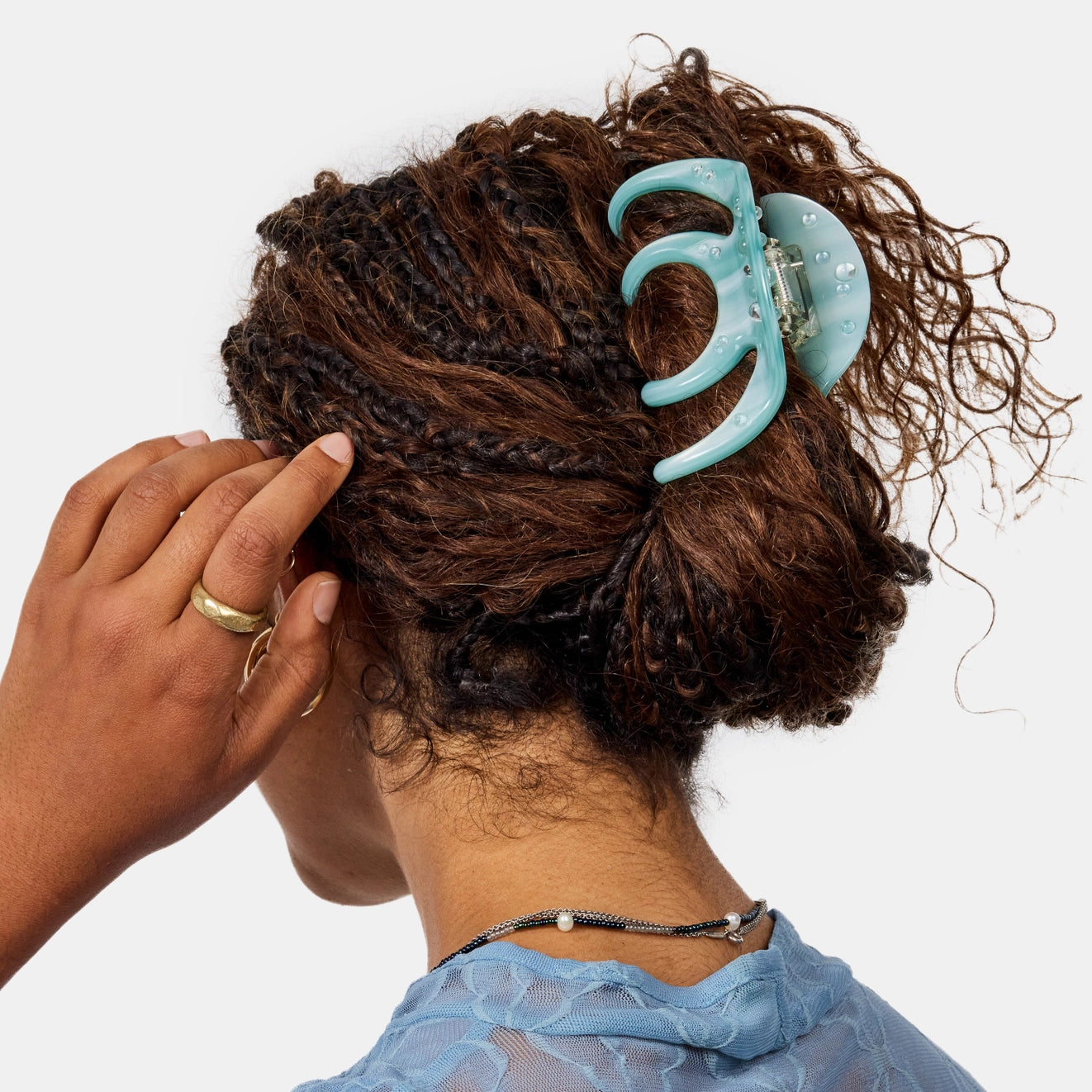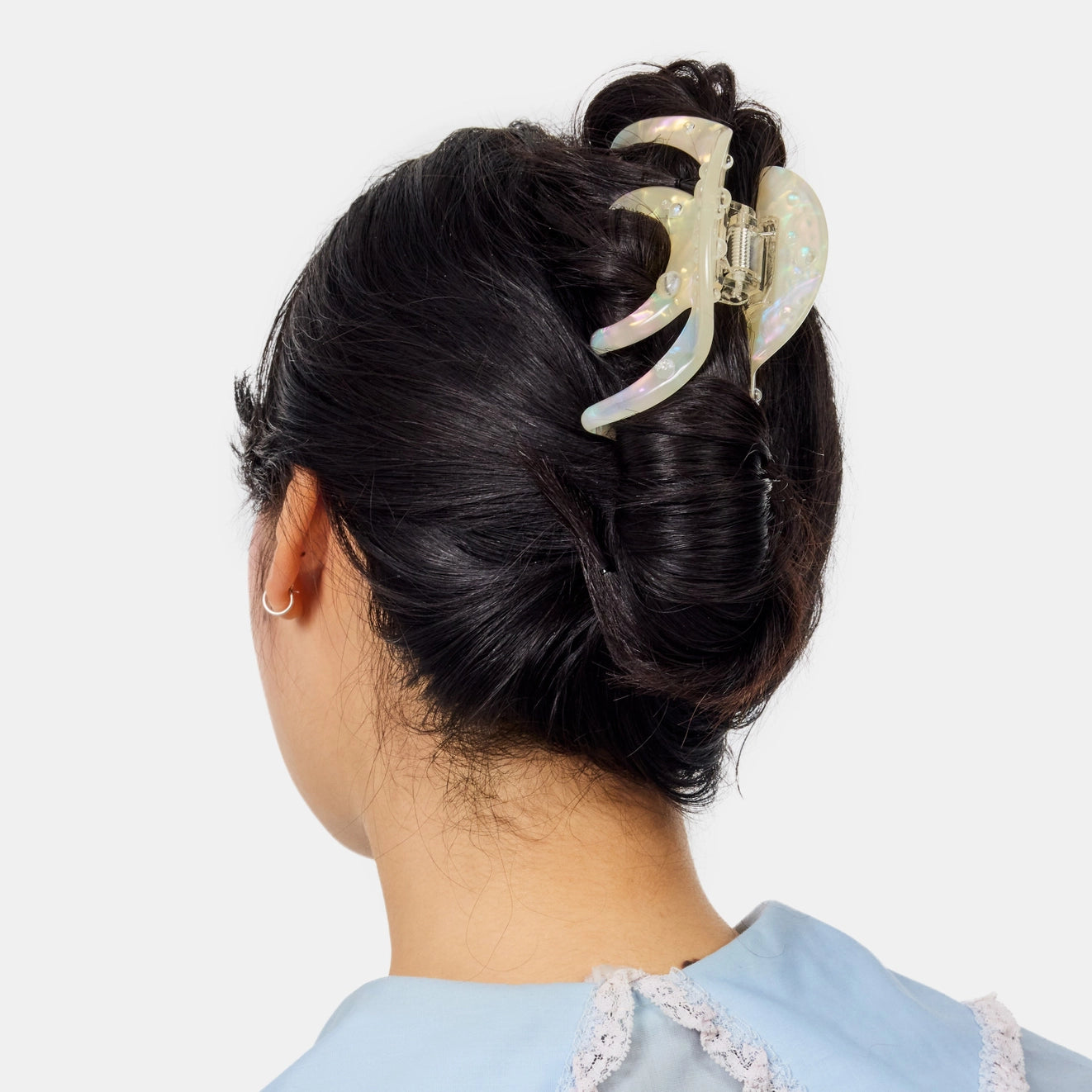 A large hair claw with interlocking teeth that provide a secure hold for thin to medium hair types and most hair textures.
