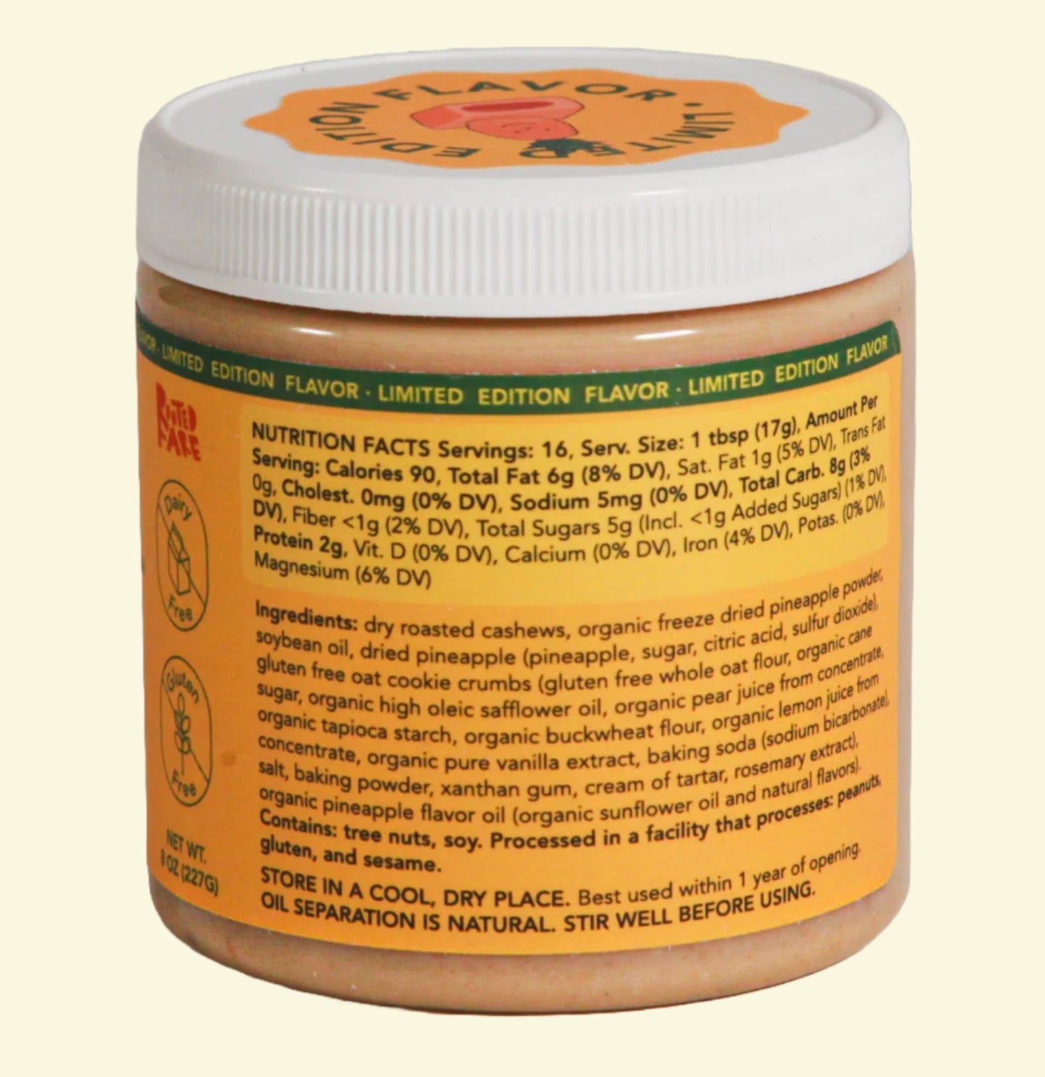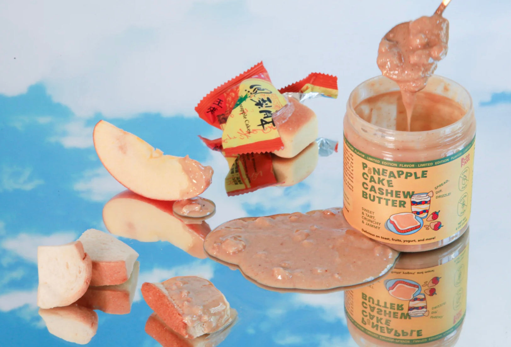 Back by popular demand. Meet one of our bestsellers. Tangy, sweet, and creamy — our Pineapple Cake Cashew Butter is like enjoying your favorite Taiwanese pineapple cake in a cashew butter. Bursting with sweet, tart pineapple flavor from organic pineapple extract, crunchy pops of crushed oat cookies, and jammy dried pineapple pieces, it's perfect for any celebration. Drizzle, spread, or grab a spoon and enjoy it on yogurt, toast, cookies, or dive in straight from the jar.