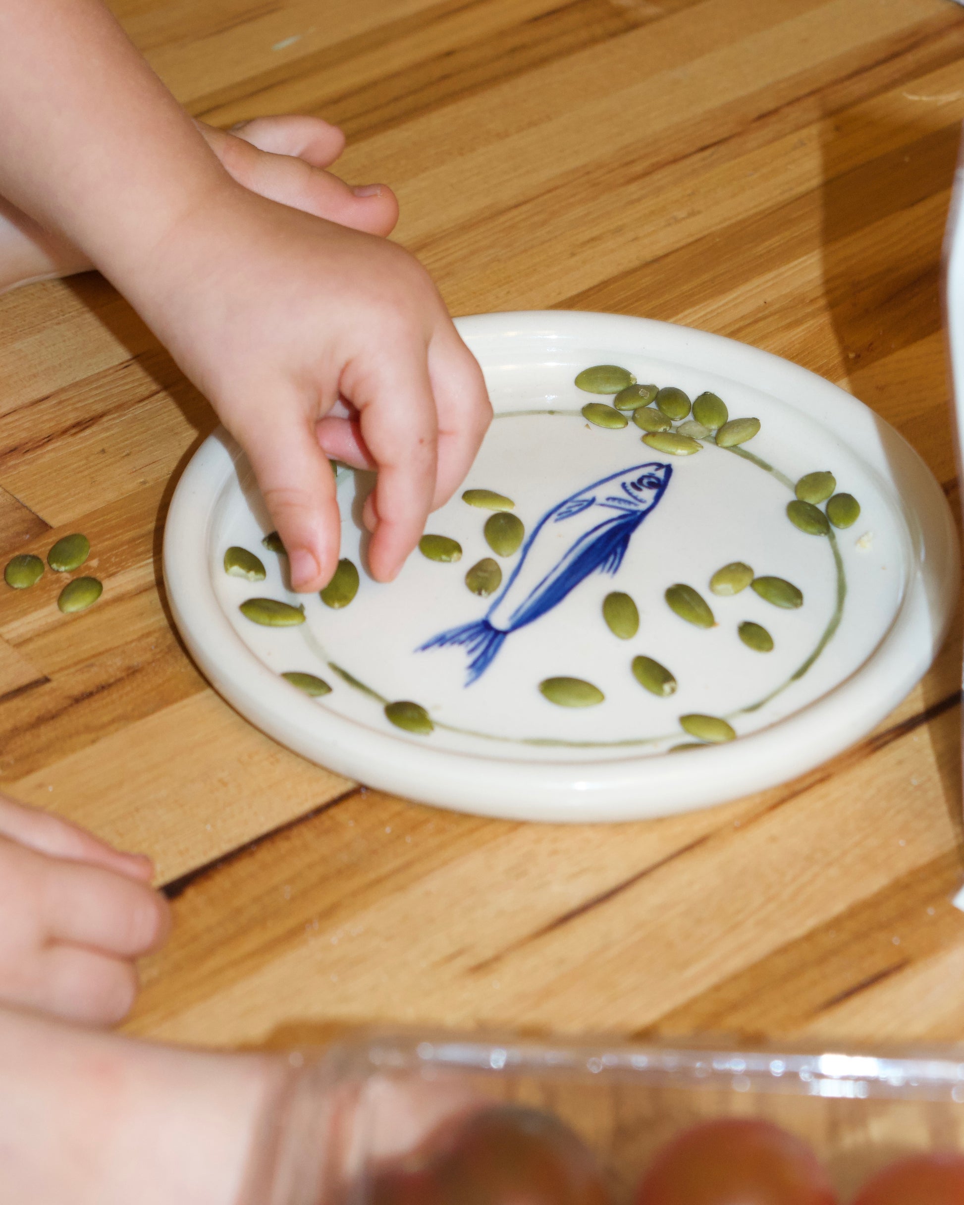 a small snack plate adorned with a lil sardine. perfect for all the kitchen needs or in your bedroom as a jewelry tray. We use ours for snacks, as a spoon rest, butter dish, side plates, catch-all, and just staring at lovingly because it looks so nice sitting on our counter. wheel thrown and hand painted. food, microwave, and dishwasher safe. made by honey honey ceramics in richmond, va.
