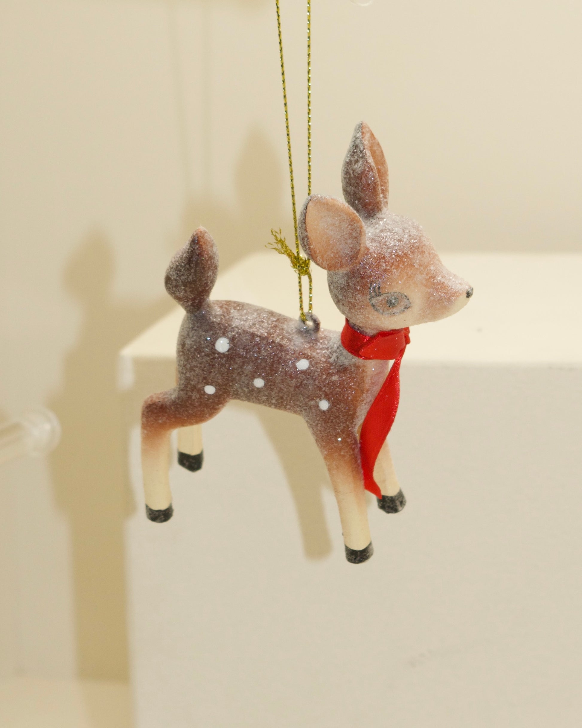 A classic christmas reindeer covered in sparkly snow to hang from your tree.